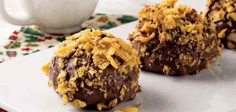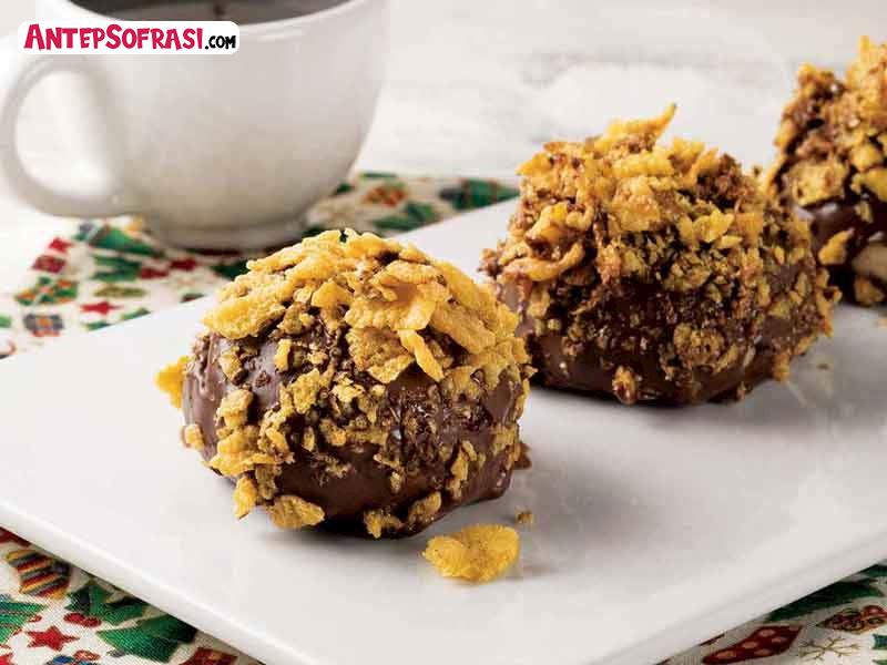 - Pişen kurabiyeleri ilk önce erittiğiniz ılık çikolata ezmesine batırın. Ardından mısır gevreklerine bulayıp servis tabağına dizin.
