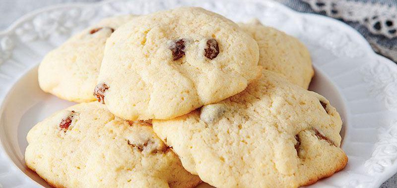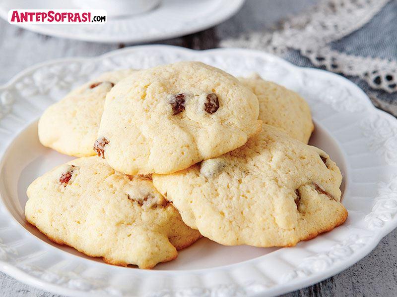 Kuru üzümleri ılık suda 15 dakika bekletin. Fırını 180 derecede ısıtın. Un, mısır unu, kabartma tozu ve tuzu bir kapta harmanlayın. Oda ısısında yumuşatılmış tereyağı ve şekeri bir cam kaseye alın. Mikserle çırpın. Yumurtaları ekleyip çırpmaya devam edin. Vanilyayı ilave edin. Kuru malzemeyi tereyağlı karışıma ekleyin. İyice karıştırın. Suyu süzülmüş kuru üzümleri ilave edin. Karışımdan birer yemek kaşığı dolusu alıp 2 santim aralıklarla yağlı kağıt konulmuş tepsiye dökün. Sıcak fırında 7-8 dakika pişirin. Iındıktan sonra servis yapın.