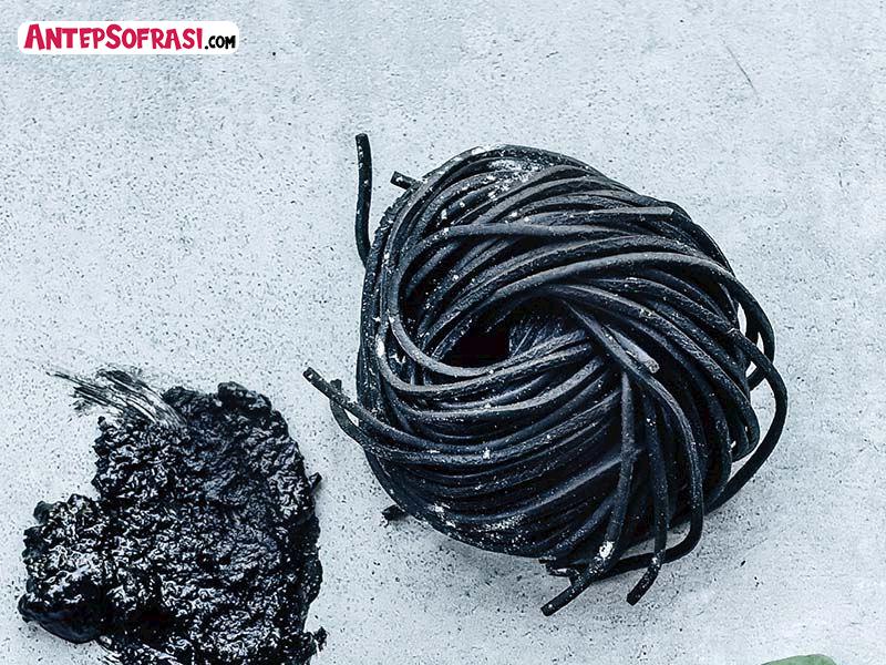 Rengini kalamar mürekkebinden alan pratik ev yapımı makarna .