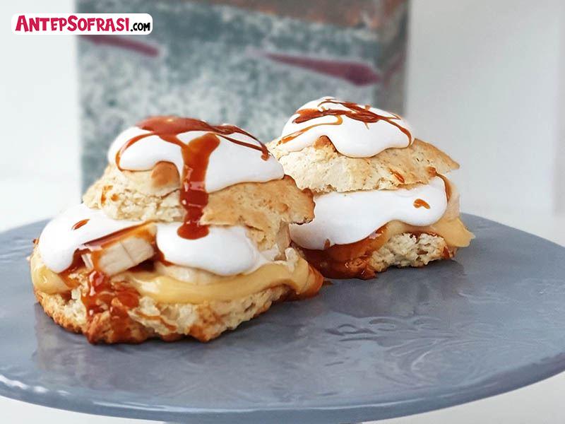 - Fırın tepsisine yağlı kağıt yayın, hamurunuzdan 6 porsiyon olacak şekilde düzensiz toplar yapın. Sıcak fırında 12 dakika pişirin. Fırından çıkınca 10 dakika kadar dinlendirin. Daha sonra elinizde sıkıca tutarak ortadan ikiye bölün. Alt tabanı servis tabağınıza alın, sırasıyla karamel sos, pastacı kreması, muz dilimleri ve soğuk çırpılmış krema ekleyin. Üst kapağını da kapatın, soğuk krema ve karamel sos ile süsleyin.