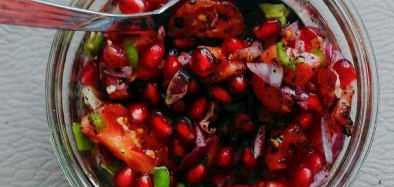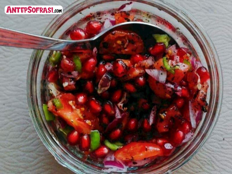 - Bir kaba nar taneleri, küp küp doğranmış sebzeler ve baharatlar koyulup karıştırılır.