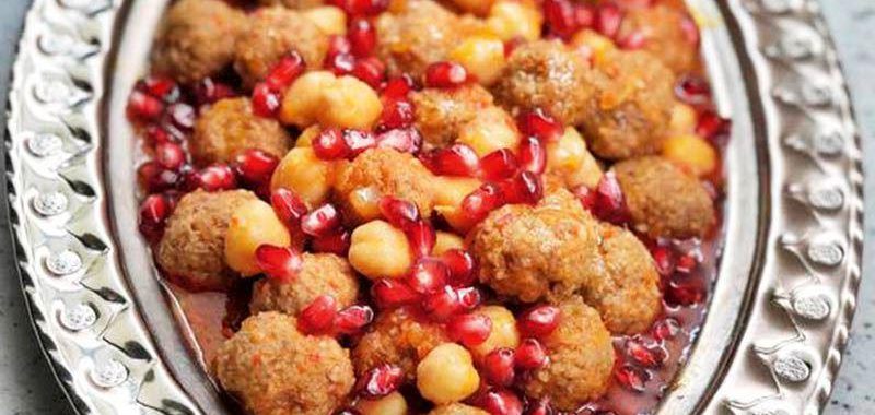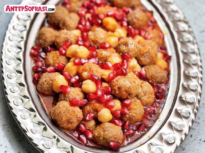 - Yarım soğanı yağda diriliğini kaybedene kadar kavurun. Salçaları ilave ederek biraz daha kavurduktan sonra sıcak su ekleyin. Su kaynayınca köfteleri ve nohutu ilave edin. 2-3 dakika piştikten sonra nar suyunu ekleyin. Biraz daha kaynadıktan sonra ocaktan alın ve ekşi narla birlikte servis yapın.