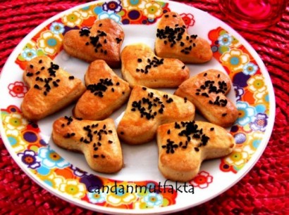 Bütün malzeme yoğrulur. Merdaneyle biraz açılır kurabiye kalıpları ile şekil verilir. Üzerine yumurta akı sürülür çöekotu veya susam serpilip firina v...