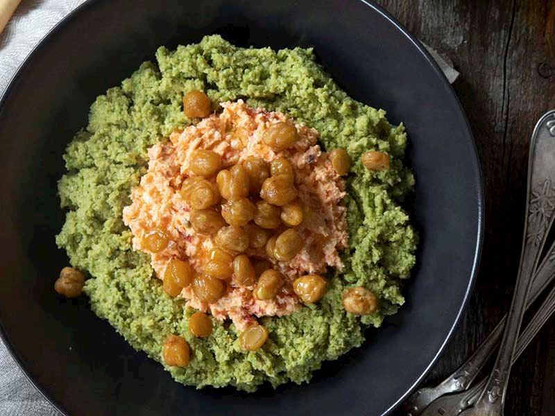 - Avokadoyu çatalla ezin. 1 diş havanda ezilmiş sarımsak ekleyip karıştırın. Avokadoyu servis tabağına ortası boş kalacak şekilde yayın. Ortasına hazırladığınız peynir ezmesini yerleştirin. En son zeytinyağında iyice kıtırlaşana kadar kavrulmuş nohutları serpin.
