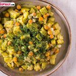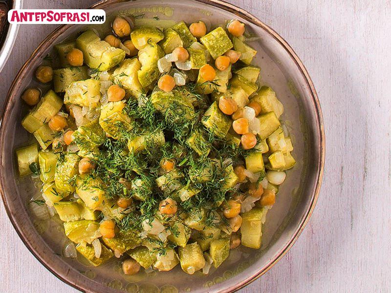 - Soğanları ve kabakları tencereye aktarıp harmanlayın. Diş diş sarımsakları ve önceden haşladığınız nohutları serpin. En son zeytinyağını döküp tencerenin kapağını kapatın. Çok kısık ateşte 20 dakika pişirin. Ocaktan alın, kıyılmış dereotunu da üzerine serpin. Tencerenin kapağı kapalı olarak oda ısısında soğumaya bırakın.