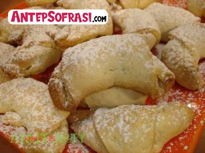 - toz şekeri ekleyin karıştırarak bir krema kıvamı elde edinIlındıktan sonra içine limon suyu ve kabuğunun rendesini ekleyin. Hamuru 3 parçay ayırın ve açın.Her parçayı 6 üçgen parça olacak şekilde kesin.içine kremadan paylaştırın ve yarım ay şeklinde rulo yapın.