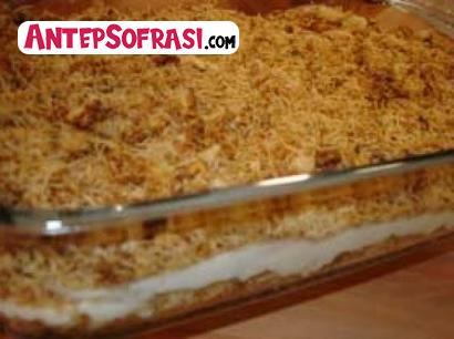 - Dikdörtgen bir kalıba tel kadayıfın yarısını zemine alın üzerine pişirdiğiniz tavuk göğsünü ilave edin ve tekrar kalan tel kadayıfı üzerie alın.