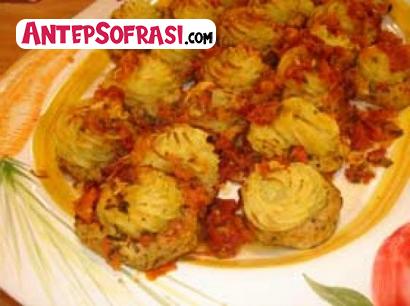- tepsiye dizilir.Püresi için haşlanmış patatesler ezilir.