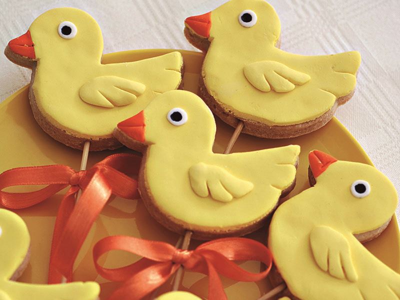 - Hamuru kurabiyenin üzerine bir miktar bal yardımıyla yapıştırın. Ördeğin gözlerini gıda boyası ile yapın.