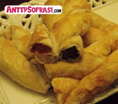 - 2) Parçalardan dört tanesinin geniş tarafına peynirli iç malzemesi yerleştirilir ve sigara böreği gibi sıkıca sarılır. Açılmalarını engellemek için uçları suya batırılır.