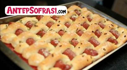 - Sosisi hamur ile örgü olacak şekilde dizin.