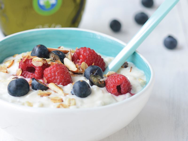 - Üzerine kavrulmuş yulaf ve bademden serpiştirip yabanmersini ve ahududu ekleyerek servis edin.