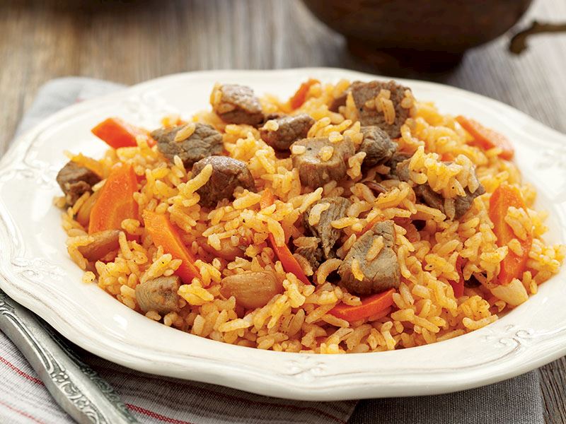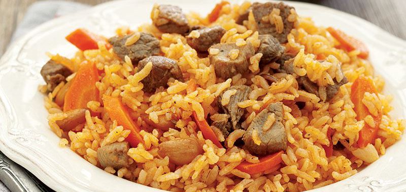 Diğer tarafta, 15 dakika sıcak suda bekletilen pirincin suyu süzülür ve soğuk suyla çalkalanır ve süzülür. Yıkanmış pirinç, kuşbaşı etin üzerine ilave edilir.