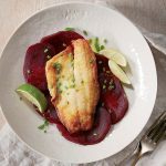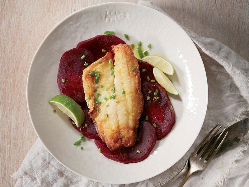 - Fileto balığın her iki tarafını una buladıktan sonra kızgın yağda kızartın. Servis tabağına önce pancar dilimlerini, üzerine de kızartmış olduğunuz balığı yerleştirin. İnce kıyılmış frenk soğanı serpin, yeşil limon dilimleri ile birlikte hemen servis yapın.