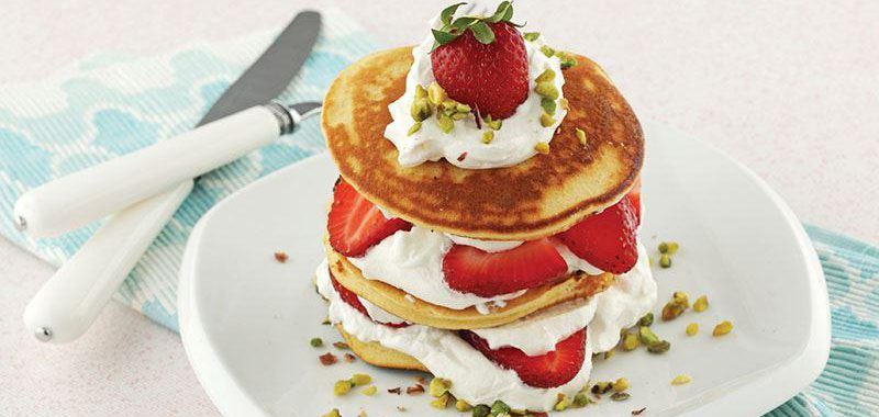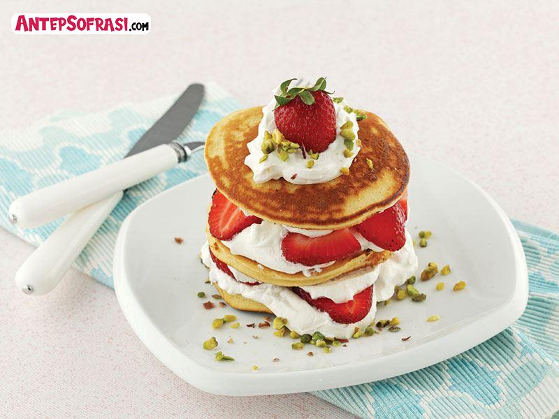 Un, kabartma tozu, vanilya ve şekeri bir kasede harmanlayın. Yumurta, süt ve eritilmiş tereyağını başka bir kasede çırpın. Un karışımını ekleyip iyice karıştırın. Yapışmaz yüzeyli tavayı ısıtın. Fırça ile çok hafif ayçiçeği yağı sürün ve hamurdan 2 yemek kaşığı kadar tavaya alıp önlü arkalı hafif kızarıncaya kadar pişirin. Hamur bitinceye kadar aynı işlemi tekrarlayın. Krema, şeker ve vanilyayı katılaşıncaya kadar mikserle çırpın. Çilekleri yıkayıp ince dilimleyin. Üç pankekin aralarına krema yayıp çilek dilimleri yerleştirerek üst üste dizin. Üzerini krema, çilek ve fıstık ile süsleyerek servis yapın.
