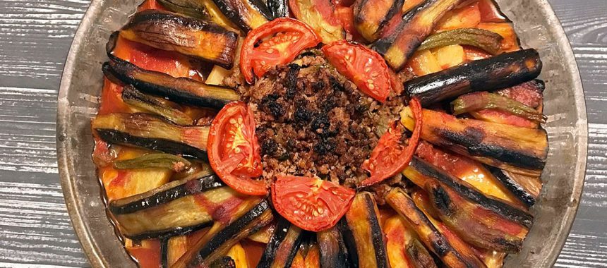 tepsimizin kenarlarına kızarmış olan patates ve patlıcanlar dizilir.kızartmamızın ortasına pişmiş olan etlerimizi yerleştiriyoruz. daha sonra domatesleri dilimleyip tepsimizin üzerine ekliyoruz,170 derece fırında domatesler solana kadar pişiriyoruz