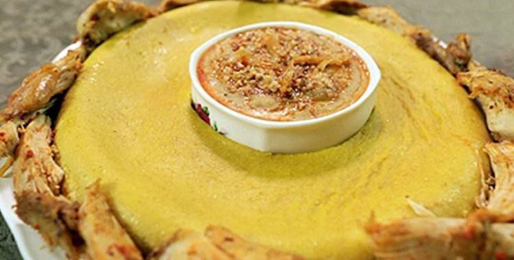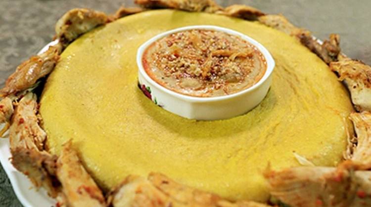 Üzerine kırmızı biber ya da tuzlu biber gezdirilir. Üzerine ceviz yayılır. Çerkez pastası için genişçe bir tencereye su ve tuz alınıp kaynatılır. Üzerine yavaş yavaş mısır unu eklenir ve hızlı bir şekilde karıştırılır.