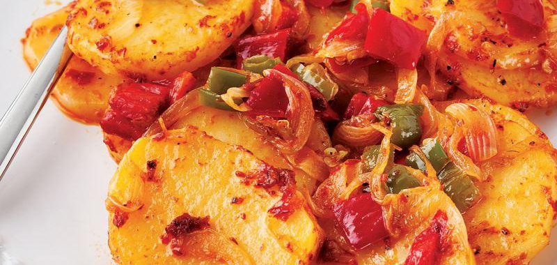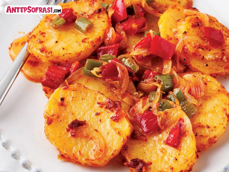 Piyazlık doğradığınız soğanı tereyağında pembeleşinceye kadar soteleyin. Küp doğradığınız biberleri ilave edip sebzeler hafif yumuşayıncaya kadar sotelemeye devam edin. Kabuğunu soyup yuvarlak doğradığınız patatesleri ilave edip tuz ve baharatlarla tatlandırın. 7-8 dakika daha pişirip ocaktan alın. Sıcak servis yapın.