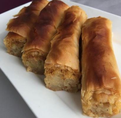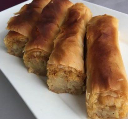 - YUFKALARIN ÜZERİNİ YAĞLAYIN.PATATESLİ İÇ MALZEMEYİ YUFKALARIN ÜZERİNE YAYIN RULO YAPARAK SARIN.