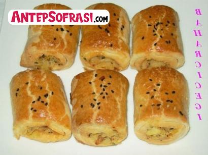 - Hamuru iki parcaya ayirin,merdaneyle diktörtgen seklinde acin,patatesli harci enlemesine hamurun bas kismina yayin. Diger bezeyede ayni islemi uygulayin, Rulo yaparak sarin,4 parmak kalinliginda kesin,üzerlerine yu