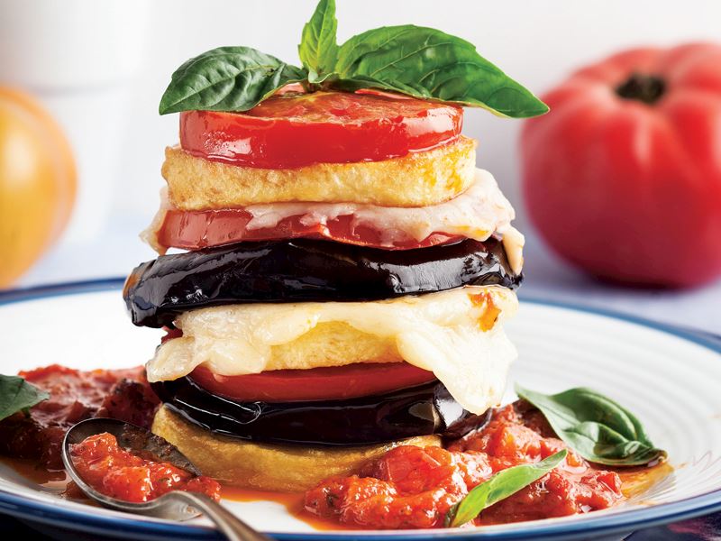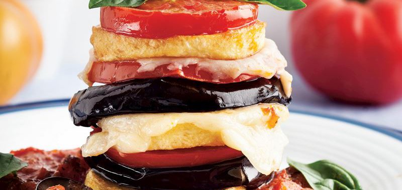 Bir fırın kabına yağlı kağıt serip üzerine 1 dilim kızarmış patlıcan, onun üzerine 1 dilim mozzarella, onun üzerine domates sosu ve sonra tekrar patlıcan dilimi olmak suretiyle 3 kat yapın. Son patlıcan diliminin üzerine tekrar domates sos ve rende mozzarella ekleyin. 4 adet bu şekilde kule hazırlayın.