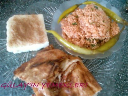 - Malzemeler:kişi başı 1 çaybardağı ince bulgur2 çaybardağı kadar zeytinyağı2 adet kuru soğan2 yemek kaşığı salçananemaydanozlimon suyutuzHazırlanışı:bulguru tuz ve nane ile bir kabın içine koyalımüzerini geçecek kadar kaynar su ilave edelim ve üzerini bir kapak ile kapatalımsoğanları yemeklik doğrayalım zeytinyağında kavuralım(isteyen çiğden kullanabilir)salçayıda ilave edip kavuralımkabaran bulgurun içine soğanları karıştıralımdiğer malzemeleride bulgura ekleyelimisteğe göre salatalık,domates,taze soğan ve değişik baharatlarda ilave edbilirsinizSakızlı muhallebi: