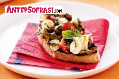 - Ekmeklerden birinin kızarmış tarafına kaşar peynirini, fırınlanmış patlıcanı, fırınlanmış domatesi, fesleğeni ve çekirdeği alınmış zeytini koyup diğer ekmeğin kızarmış tarafını malzemelerin üzerine kapatın ve hafifçe bastırın.
