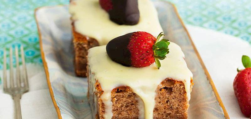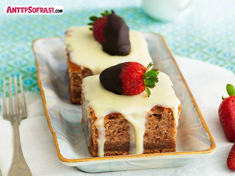 - Keki fırından alın, tel ızgara üzerine koyarak soğumasını sağlayın. Soğuyunca eşit büyüklükte karelere bölün ve üzerine beyaz çikolata ganaj dökün. Ganaj donmaya başlayınca çikolataya batırılmış çilekleri yerleştirerek servis yapın.