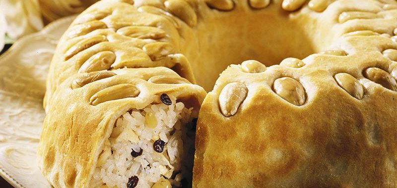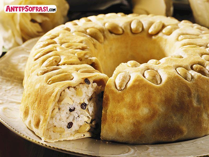 - Pilavı ilave edip sarkan kısımları içe doğru kıvırıp kapatın. Önceden ısıtılmış 180 derece fırında 15-20 dakika pişirin. Servis tabağına ters çevirip servis yapın.