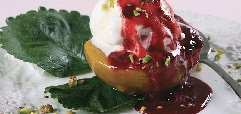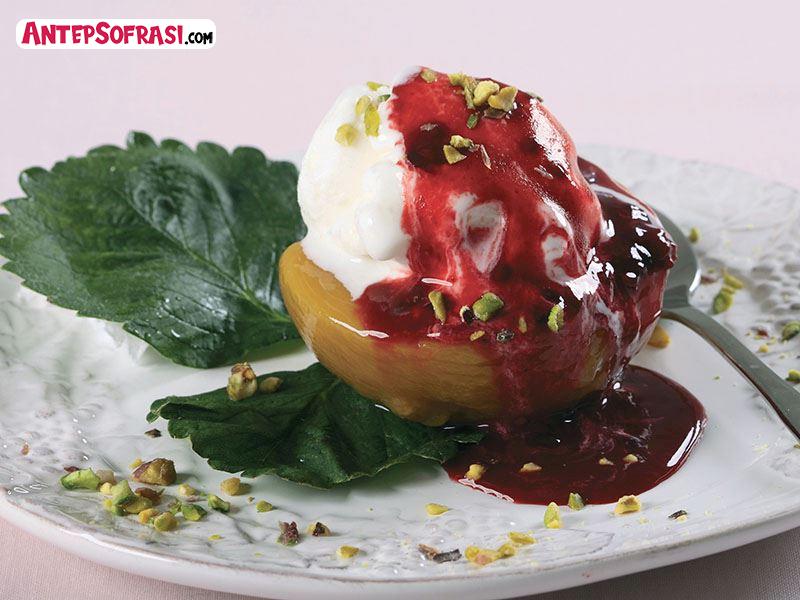 Pratik tatlı tarifleri arasında iyi bir seçim. Şeftalilerin kabuklarını soyup ortadan ikiye ayırın. Su, toz şeker, vanilya ve şeftalileri tencereye alıp orta ateşte 30 dakika kaynatın. Ocaktan alarak soğumaya bırakın. Şeftalileri şurubun içinden çıkartıp kağıt havlu üzerinde bekletin. Sos için, frambuaz, pudra şeker ve limon suyunu mutfak robotunda 1 dakika karıştırarak püre haline getirin. Şeftalileri, kesik tarafları yukarı gelecek şekilde servis tabağına yerleştirin. Ortalarına vanilyalı dondurma paylaştırın. Frambuaz sosunu üzerine döküp, Antep fıstığı ile süsleyerek servis yapın.