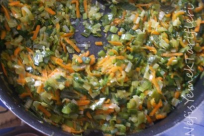 - Genişçe bir tavaya biraz sıvı yağ konur ve pırasalar ile havuçlar ilave edilerek yumuşayana kadar pişirilir.