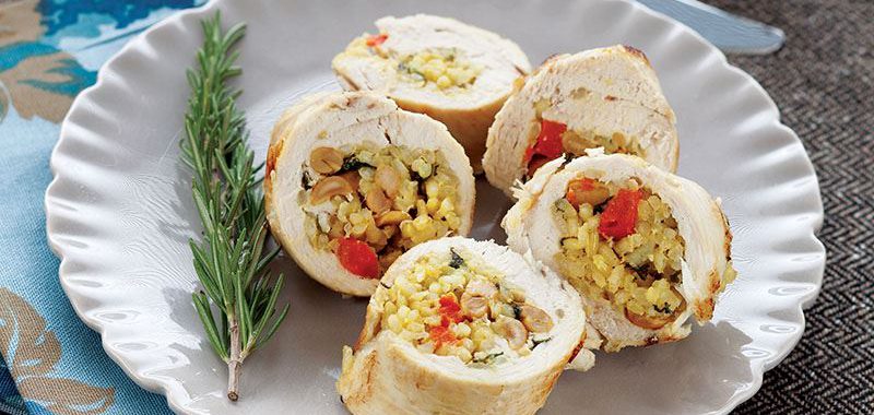 Tavuk etlerini bıçakla açtıktan sonra et döveceği ile inceltin. Tuz, karabiber serpiştirin. Pirinçleri bol suyla yıkayıp süzün. 1 yemek kaşığı yemeklik zeytinyağı ile yarım yemek kaşığı tereyağını eritin. Yemeklik doğranmış soğan ile kaju fıstıklarını 2-3 dakika kavurun. Pirinci ilave ederek karıştırmaya devam edin. Fesleğen hariç tüm baharatları, tuz ve suyu ekleyin. Kapağı kapalı olarak pilav suyunu çekinceye kadar pişirin. Pilav tamamen suyunu çekince, ateşi kapatıp fesleğenleri ekleyin ve soğumaya bırakın. İnceltilmiş tavuk etlerinin içlerine pilav doldurup alüminyum folyo ile sıkıca sarın ve uçlarını kapatın. Fırın kabına dizip yarısına gelecek kadar sıcak su ilave edin ve 200 derece fırında 30 dakika pişirin. Fırından çıkarttığınız tavukları folyodan çıkartın ve az tereyağı eklediğiniz yapışmaz tavada birkaç dakika kızartın. Dilimleyerek sıcak servis yapın.