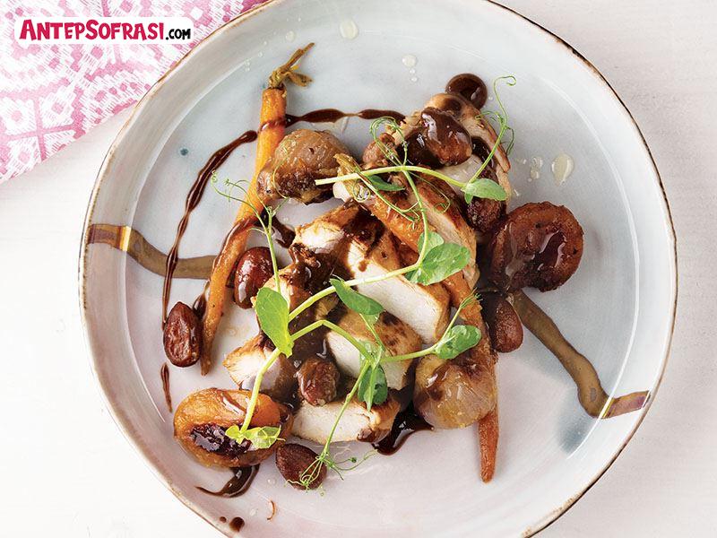 - Servis tabağına pişirdiğiniz tavuk göğsünü dilimleyin. Yanına pişen sebzeleri, kayısı ve bademleri koyarak servis yapın.