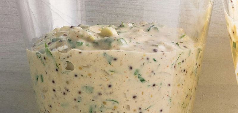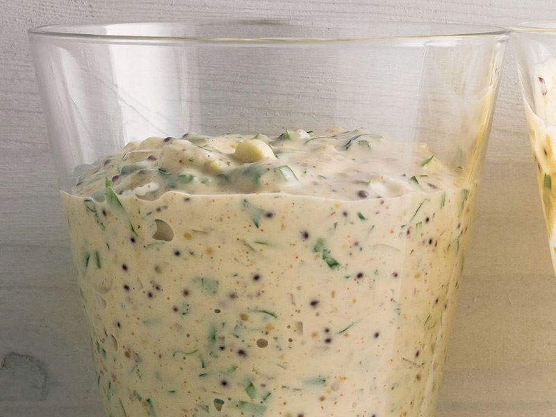 • Derin bir kasede mayonezi, hardalları, limon suyu, worcestershire sosu ve üzüm sirkesini karıştırın. Arpacık soğanları minik küpler halinde ince doğrayın. Taze soğan, sap kereviz ve maydanozu ince kıyın. Doğradığınız arpacık soğanları ve ince kıydığınız yeşillikleri mayonezli karışıma ekleyin. Ezilmiş sarımsağı, tuz ve baharatları ilave edip iyice özdeşleşene kadar karıştırıp servis yapın.
