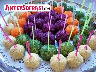 - Buzdolabında 10 dakika bekletilir, ceviz büyüklüğünde toplar yapılıp isteğe göre havuç rendesi, nane, çörek otu veya susam ile mantolanır.