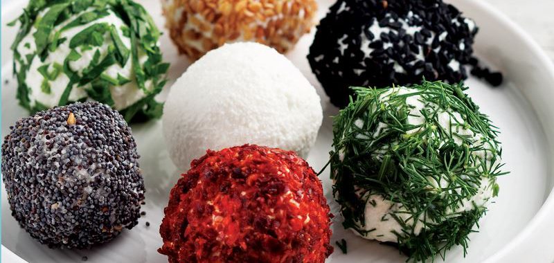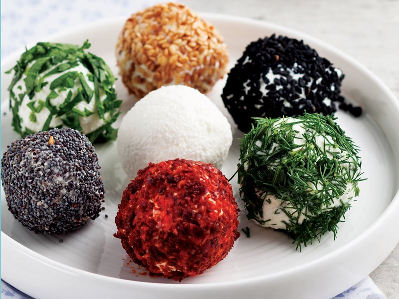 Tüm peynirleri geniş bir kasede karıştırıp yoğurun. Ceviz büyüklüğünde toplar yapın. Üzerlerini maydanoz, dereotu, pul biber, susam, çörek otu ve haşhaşla kaplayıp, servis yapın.