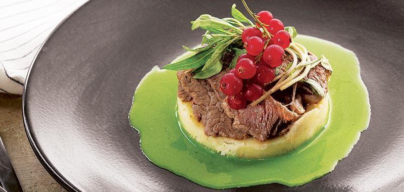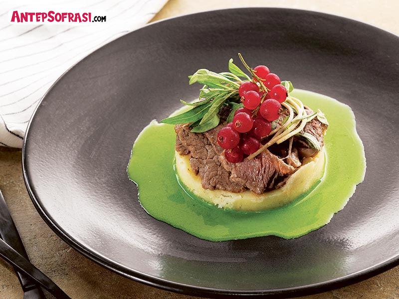 - Servis tabağına patates püresini yayın, üzerine karnabaharı ve en son antrikot dilimlerini koyun.