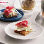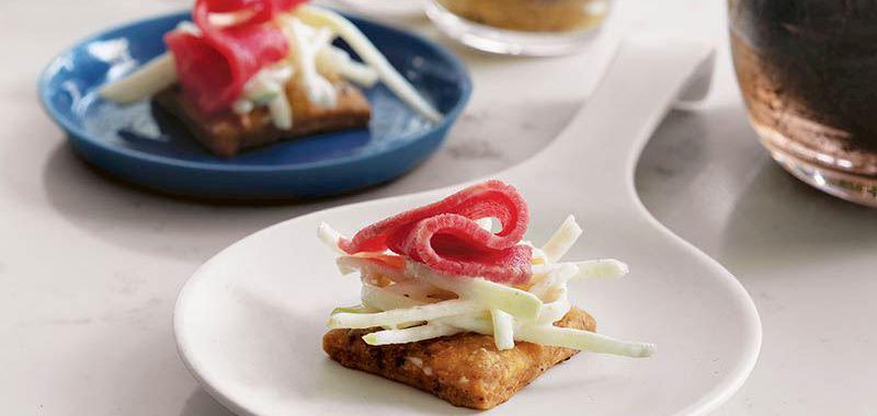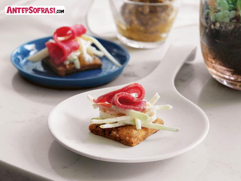 - Hardal ve rozbif hariç tüm malzemeleri karıştırıp krakerlerin ortasına yerleştirin. Üzerini rozbif ve hardalla süsleyip servis yapın.