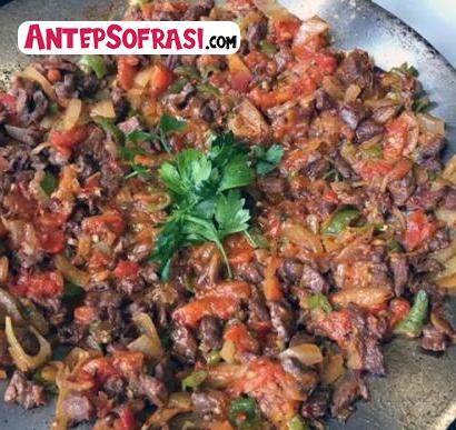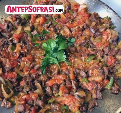 - Etin orta yerinden yer açarak soğanlar,sivri biberler ve doğranmış domatesler ilave edilir. ara ara karıştırılıp diriliği gidinceye kadar ve domateslerin bıraktığı su, buhar olup uçuncaya kadar kavrulur.