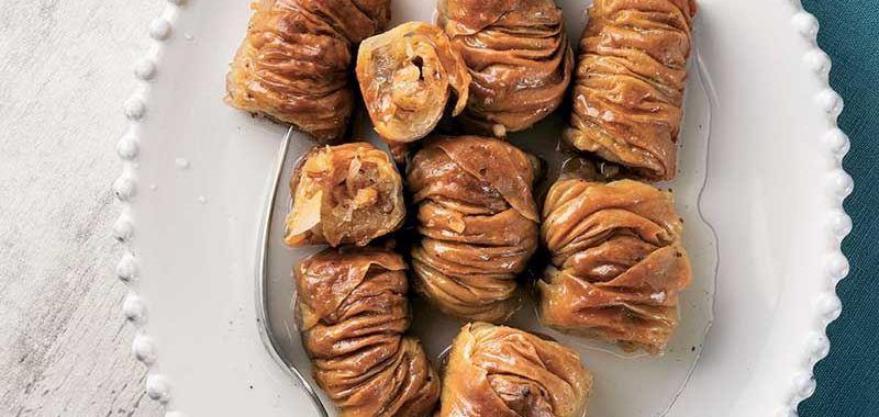 - İç harcı için; cevizi toz şekerle karıştırın. Bezelerden bir tanesinin üzerine nişasta serpip oklavayla ince bir yufka açın. Üzerine 1-2 yemek kaşığı şekerli ceviz serpiştirip yufkayı ortadan ikiye kesin.