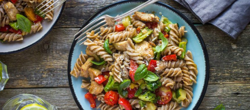 Kepekli burgu makarnayı haşlayıp suyunu süzün. Sosu için zeytinyağını bir sos tenceresinde ısıtın. Ezdiğiniz sarımsak, küp doğradığınız sebzeler ve soya sosunu ekleyip karıştırın. Tencerenin kapağını kapatıp sebzeler suyunu çekene kadar pişirin. Süzdüğünüz makarnayı sebzelerin üzerine ekleyip tuz ve baharatlarla tatlandırın. Rendelenmiş light beyaz peynir ve taze kekik dalları ile süsleyip servis yapın.