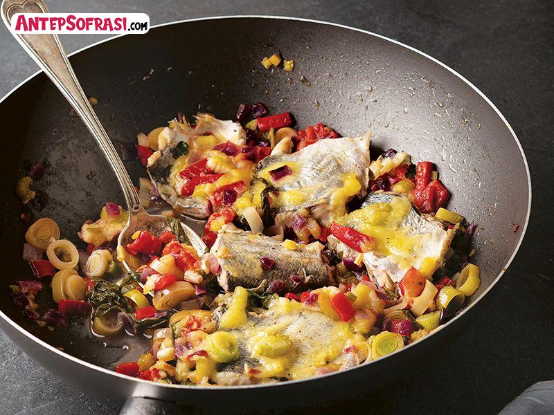 - Birkaç dakika daha kavurmaya devam edin. Balık etlerini kavurduğunuz sebzelerin üzerine yerleştirin.