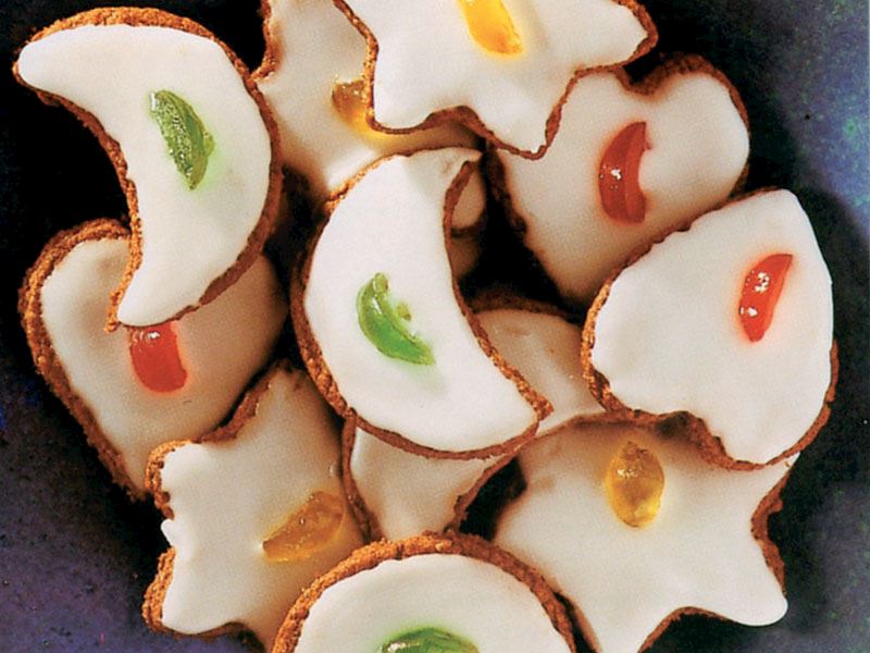 - Hamuru yaklaşık 5 mm. kalınlığında açın. Ay ve yıldız kalıplarıyla parçalar kesin. 190 derecede ısıtılmış fırında pişirin.