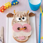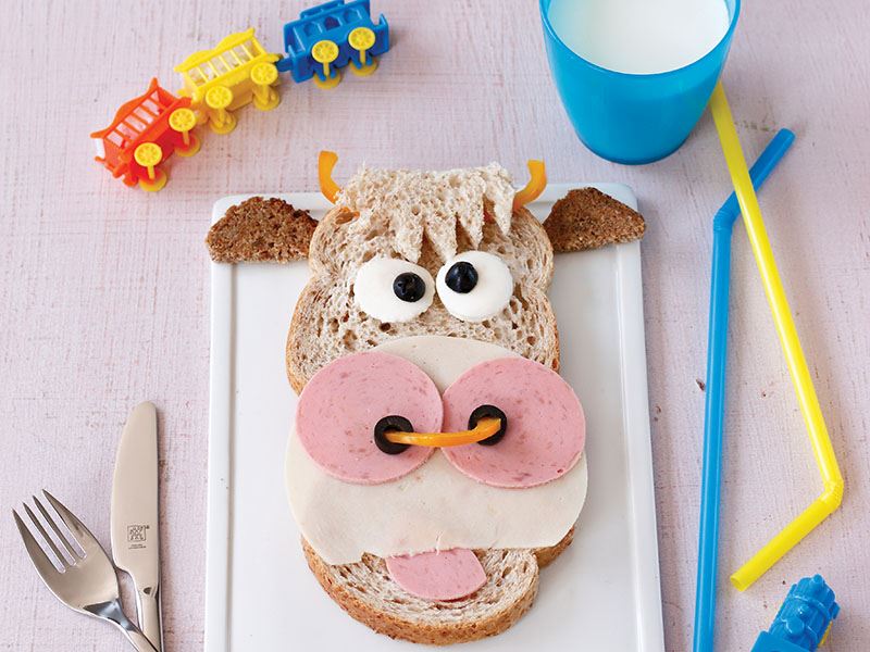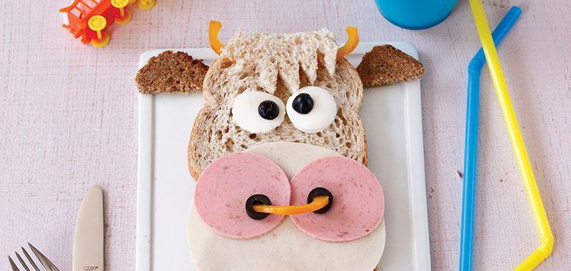 Kepekli ekmeği kullanarak ineğin yüzünü ve saçını hazırlayın. Çavdar tost ekmeğinden kulakları kesin. Mozzarella peyniri ve siyah zeytin ile gözleri, jambon ve salamlarla ağız kısmını hazırlayın. Siyah zeytin ve sarı biber parçaları ile burnunu tamamlayın. Yine sarı biber parçalarıyla kulakları oluşturup servis yapın.