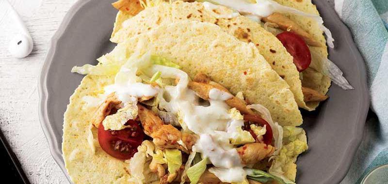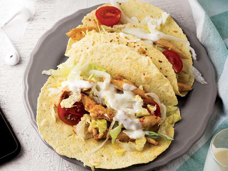 - Lavaşları da aynı şekilde, tavada veya fırında ısıtın. İnce doğranmış göbek veya kıvırcık, şerit kesilmiş tavuk parçaları ve ikiye bölünmüş çeri domatesleri lavaş ekmeğinin ortasına yerleştirin.