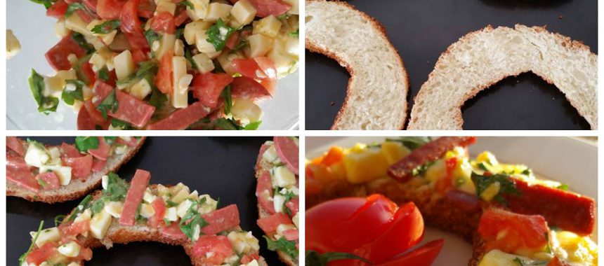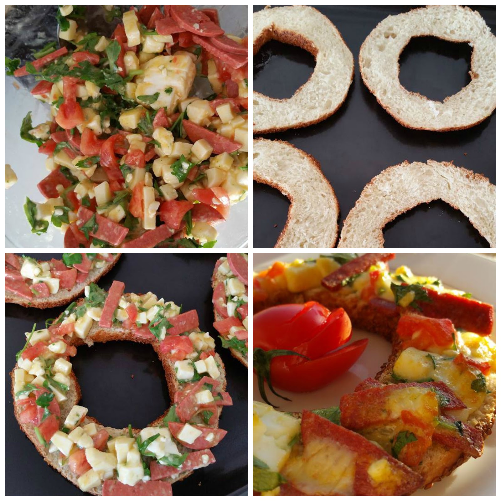 Açtığımız simit çukurlarına bu karışımı doldurup üzerine diğer malzemelerimizi yerleştiriyoruz. (tercihe bağlı olarak malzemeleri elbette değiştirebilirsiniz)