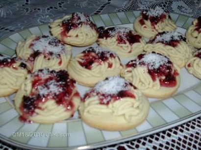 - oda ısısındaki yağımızı şekeri güzelce yedirin bir birine sonra vanilyalı pudingi vanilyayı yumurtayı unu ekleyip güzelce yorğurun ve hamurumuzdan büyük bir parça alıp merdane ile açalım ve yuvarlak kalıp veya bardakla keselim yağlı kağıt serilmiş tepsiye dizelim daha sonra evimizde bulunan demir sarımsak ezeceğine hamurdan koyup kestiğimiz hamurların üzerine sıkalım yeterincede sıkınca uç kısmını bıçakla ayırın ve fırına verip fazla kızartmadan 160 derecede 10,12 dk pişirelim üzeine soğuyuncada çilek vs,,, marmelatı koyup hindistan cevizi serpiştirip servise hazır edelim