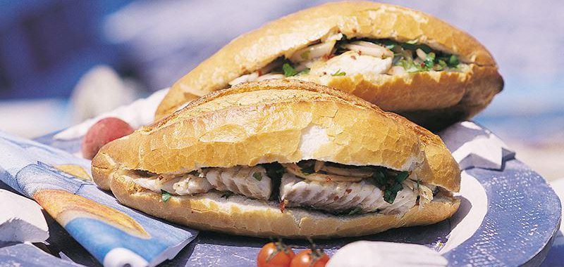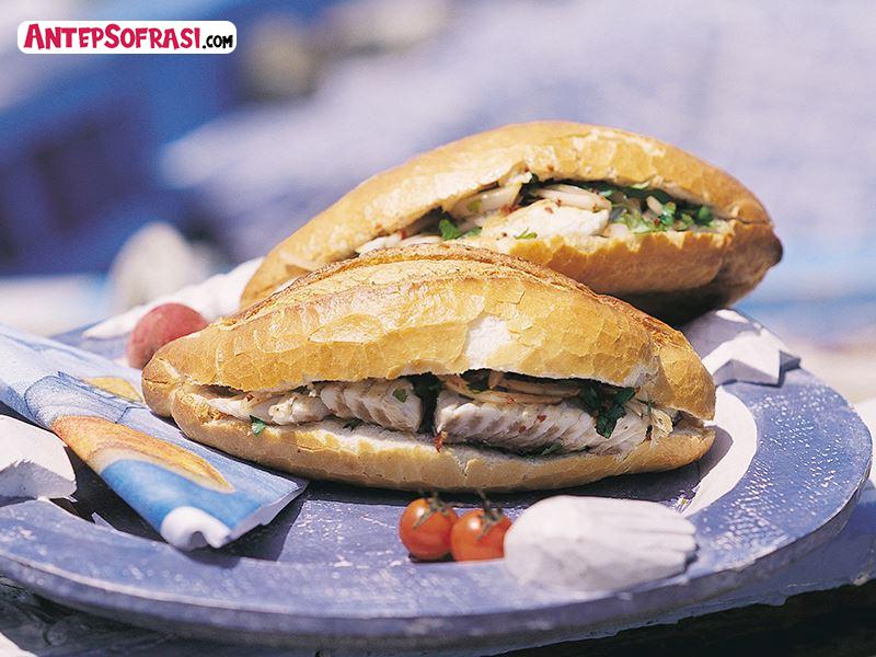 Filetoların üzerine hafifçe zeytinyağı sürüp ızgarada iki taraflı olarak pişirin. Soğan, maydanoz, pulbiber, tuz ve karabiberi bir kapta harmanlayıp biraz ezerek karıştırın. Ekmekleri sandviç şeklinde ikiye kesip bir parça balık ve maydanozlu soğanı arasına yerleştirin. Sıcak olarak servis yapın.