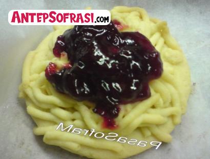 - Yumurta,tereyagini ve pudra sekerini karistirilir.Pudingi ve unu ilave edip kulakmemesi kivaminda bir hamur yogurun.Hamuru bekletmeden beze yapip 3-4 mm kalinliginda acin.Bardakla yuvarlak sekilde kesin.Kestiginiz yuvarlaklari yagli kagit serilmis yada yaglanmis firin tepsisine alin.Kalan hamurlari bir sarimsak ezecegi yardimi ile yuvarlaklarin üzerine sıkın.Yeteri kadar sıkınca bicak yardimi ile sarimsak ezeceginden hamuru ayirin.160 dereceli önceden isitilmis firinda 10-12 dakika pisirin.Firindan cikan ve soguyan kurabiyelerin üzerine bir kasik kadar marmelat koyup üzerine hindistan cevizi serpip servis yapin.
