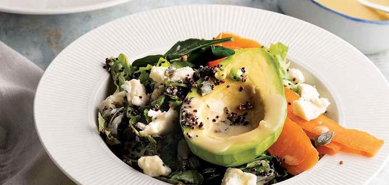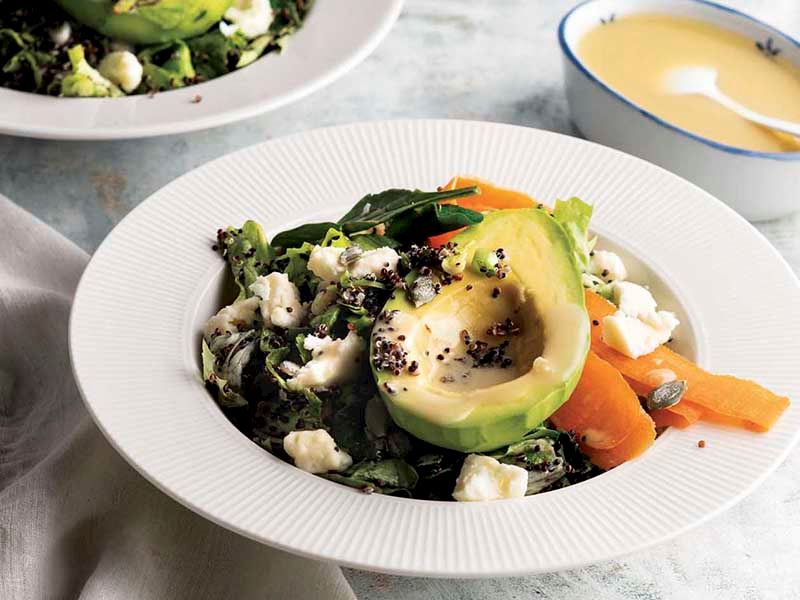- Kıvırcık marulu yıkayın ve suyunu iyice süzdürüp kurutun. İrice doğrayıp bir kaseye alın. Taze soğanları, ince kıyılmış yeşillikleri, haşlanmış kinoayı, baharatları ekleyip karıştırın. Zeytinyağı ve limon suyunu gezdirin. İnce yaprak şeklinde dilimlenmiş havuç dilimlerini ve peynir parçalarını ekleyin. En son üzerine kabuğu soyulmuş ve limon sürülmüş yarım avokadoları yerleştirin.